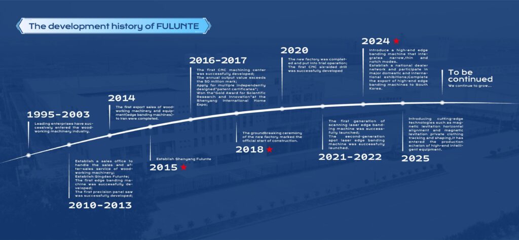 Fulunte was established in 2013 with a registered capital of 30 million yuan,Headquartered inShenyang,known asthe”Oriental Ruhr”,the company has profound industrial manufacturing background.Along the way,the enterprise has alwaysbeen adhering to the original intention,paying at-tention to details and services.At present,theannual production scale ofthe enterprise hasreached 1,500panelfurnitureproductionlines,with an annual output value of 120 million,creating more than 150 jobs and a tax payment ofmore than8 million yuan.lt has becomealarge-scale enterprise integrating”scientific research,manufacturing,sales and service”.Fulunte has a strong R&D and design team,strong technical backbone reserve and professional after-sales service strength.With alongproduct line and awidevariety of products,itcovers all kinds of products related to woodworking machinery industry,such as numerical controlmachining centers,full-automatic linear edgebanding machines.Precision cutting saws laserscanning side hole drills,electronic cutting sawsnumerical control sixsided drills,etc.. and can-provide”one-stop”solutions according to custom-ers needs to create unexpected values for cus-tomers.